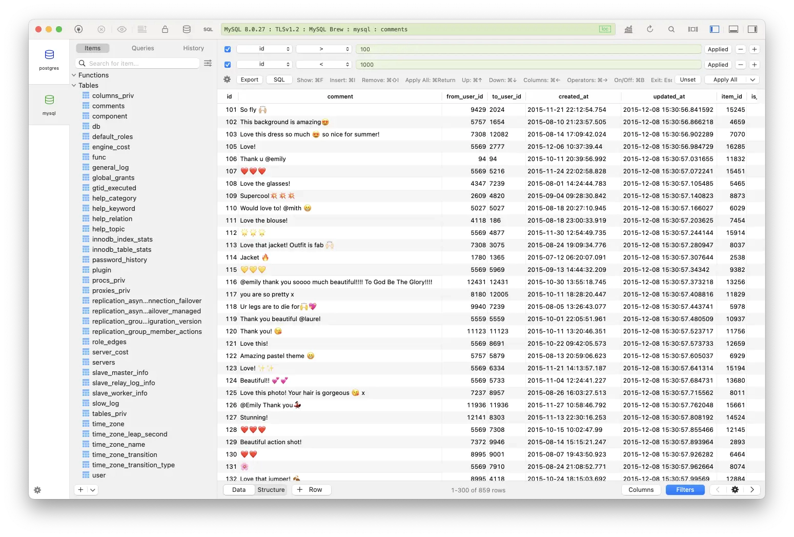 TablePlus is a modern, lightweight, and intuitive database management tool fit for macOS, Windows, and Linux. It offers an easy-to-use interface for managing various relational and a few NoSQL databases.